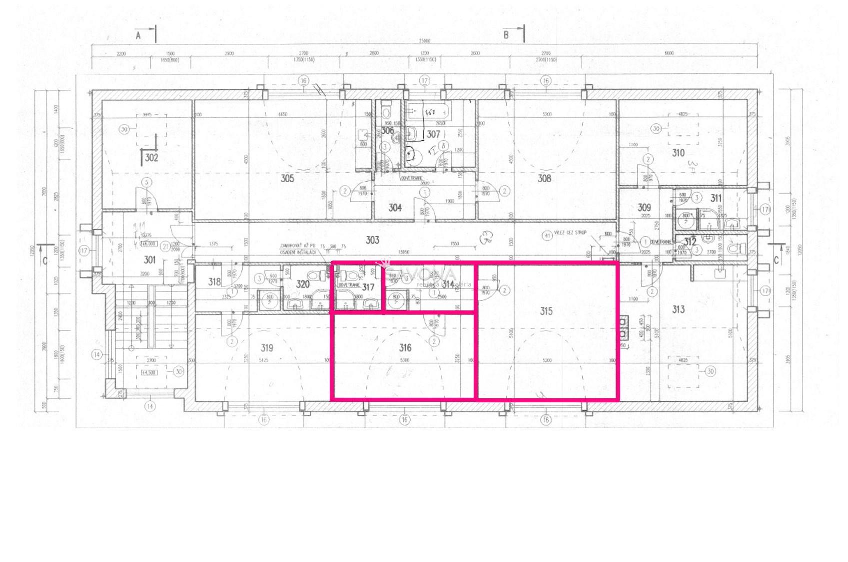 • priestory o výmere 43,70 m2 pozostávajúce z dvoch miestností, t.j. miestnosť 26,5 m2 (č. 315) a 17,2 m2 (č. 316) / pôdorys v prílohe